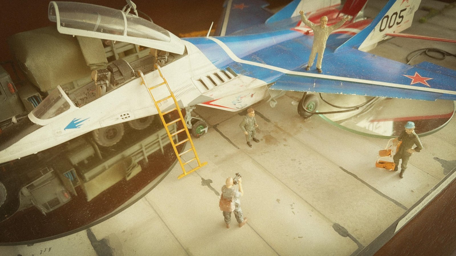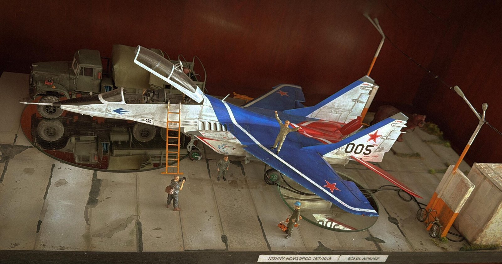 Entre tantas montagens, uma das que mais orgulha o plastimodelista é a recriação de uma base aérea russa, com o MiG-29 e um caminhão, recriados exatamente como no dia em que ele teve a experiência de voar naquele avião. Em uma cena de 40 x 80 cm, cada detalhe foi reproduzido: da sujeira do chão, do avião, das figuras, até da bicicleta do mecânico. “Foi como eternizar um momento da minha vida em miniatura”, lembra.