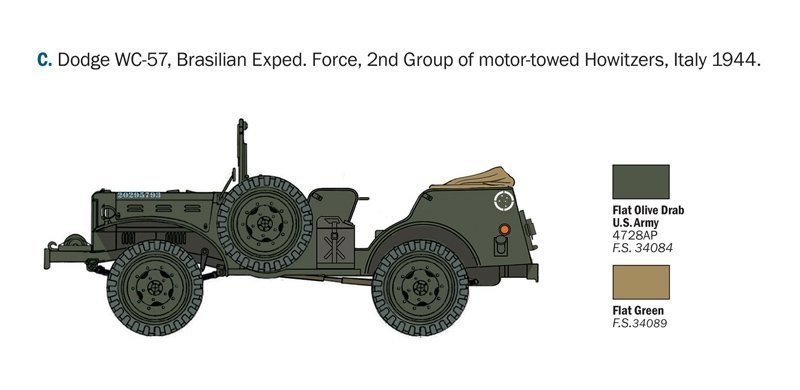 NOVOS DECALQUES PARA 3 VERSÕES (versao brasileira)A linha Dodge WC de veículos de transporte militar foi amplamente produzida pela indústria americana durante a Segunda Guerra Mundial. O desenvolvimento da série WC 51-52 teve como objetivo criar um “veículo utilitário” leve e com tração nas quatro rodas, caracterizado por grande confiabilidade em todos os ambientes de utilização e boa capacidade de transporte. O projeto foi extremamente válido e junto com o famoso “Jeep” Willys de ¼ de tonelada, o Dodge WC ¾ de tonelada “Beeps” foi o veículo mais produzido pelas fábricas americanas durante a Segunda Guerra Mundial e contribuiu significativamente para satisfazer as necessidades logísticas do exército americano. em diversas frentes. O veículo Dodge, graças à sua boa capacidade de quase 700 kg, que poderia ser ampliada com a aplicação de “reboques” traseiros, foi produzido em inúmeras versões e com diferentes configurações: caçamba, cabine aberta, transporte de tropas, munições e armamento. Em detalhe, a versão WC-56 foi dedicada a tarefas oficiais de ligação, comunicações e transporte.