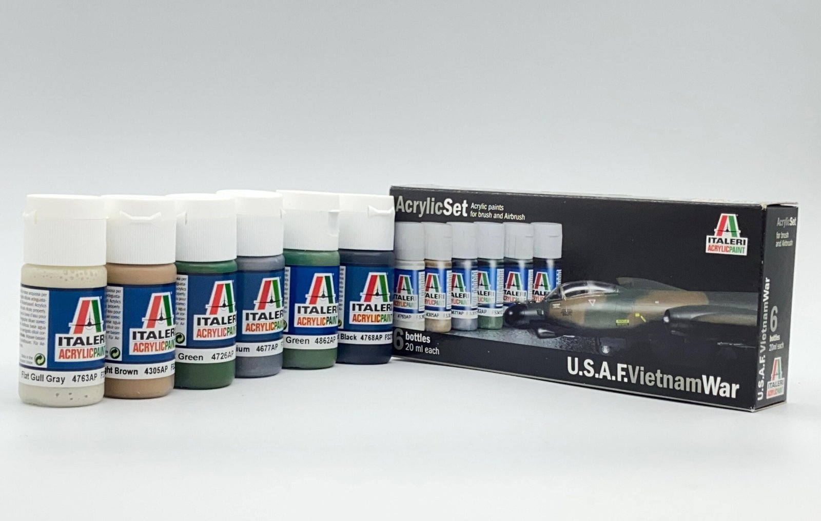 Cada conjunto contém 6 frascos de Tintas Acrílicas Italeri (20ml cada)