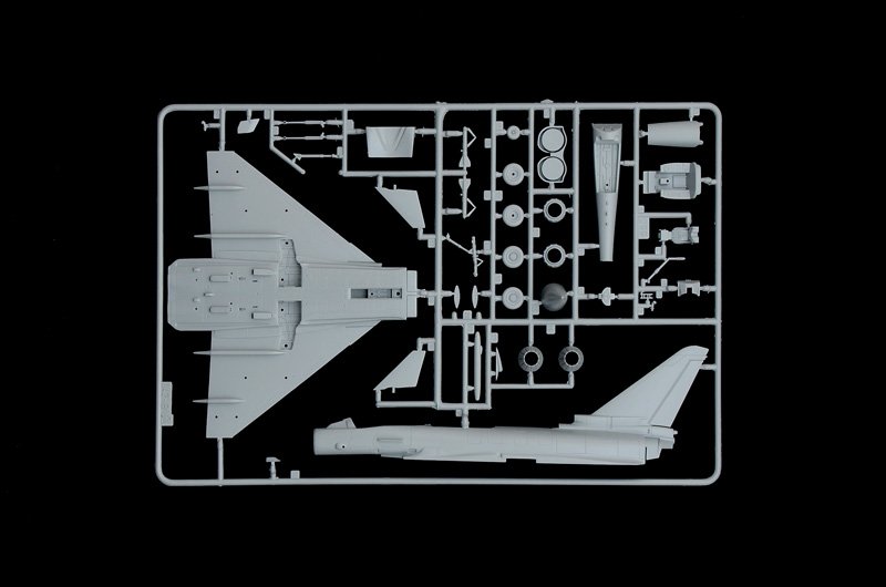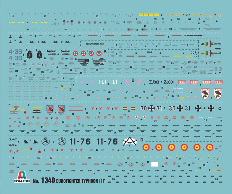 SUPER DECAL O projeto Eurofighter, desenvolvido a partir da segunda metade da década de 1980 por um conjunto de empresas europeias, tinha como objetivo criar uma aeronave de combate avançada, multifuncional e com forte especialização em interceptação. O resultado do projeto é o “Typhoon” que é hoje um dos melhores caças de superioridade aérea do mundo. Sua estrutura aerodinâmica é caracterizada pela asa delta e winglets canard. Seus dois motores turbojato com pós-combustão garantem excelente desempenho e permitem atingir Mach 2. A alta tecnologia de bordo, potencializada pelo sistema de controle fly-by-wire, permite grande dirigibilidade em combate aéreo. Versões de dois lugares também foram desenvolvidas para treinamento avançado de pilotos, a fim de garantir a transição progressiva de aeronaves que, como no caso dos F-104 italianos, eram muito mais antiquadas e datadas.