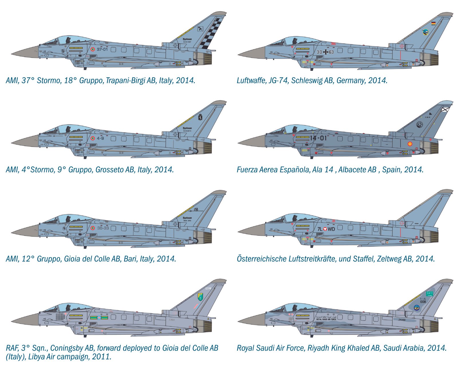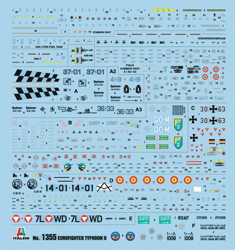 SUPER DECAL PARA 8 VERSÕES O projeto Eurofighter, desenvolvido a partir da segunda metade da década de 1980 por um conjunto de empresas europeias, tinha como objetivo criar uma avançada aeronave de combate multifuncional com forte especialização em interceptação. O resultado do projeto é o “Typhoon” que é hoje um dos melhores caças de superioridade aérea do mundo. Sua estrutura aerodinâmica é caracterizada pela asa delta e winglets canard. Seus dois motores turbojato com pós-combustão garantem excelente desempenho e permitem atingir Mach 2. A alta tecnologia de bordo, potencializada pelo sistema de controle fly-by-wire, permite grande dirigibilidade em combate aéreo. Versões de dois lugares também foram desenvolvidas para treinamento avançado de pilotos, a fim de garantir a transição progressiva de aeronaves que, como no caso dos F-104 italianos, eram muito mais antiquadas e datadas.