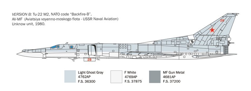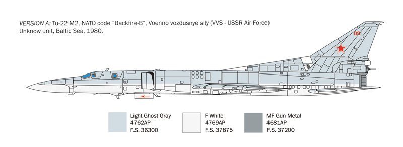 MOLDES ORIGINAIS ESCI – NOVOS SUPER DECALQUES PARA 3 VERSÕES – INSTRUÇÕES DE CORESDesenvolvido no final da década de 1960, o Tupolev TU-22M “Backfire” entrou em serviço nas forças aéreas soviéticas durante a década de 1970 e pode ser considerado, também pelo seu design característico, um ícone da Guerra Fria. O “Backfire” é um bombardeiro estratégico bimotor com asas de geometria variável, capaz de transportar e empregar armas nucleares e convencionais. Uma aeronave avançada para a época, foi uma melhoria acentuada em relação aos bombardeiros estratégicos soviéticos anteriores. Graças aos seus dois potentes motores, instalados sob a cauda, o bombardeiro Tupolev podia atingir a velocidade de Mach 1,9 e constituía um adversário formidável para a defesa aérea dos EUA e dos países da NATO. O “Backfire” também era especializado em ataques convencionais contra navios de superfície. Com o fim da União Soviética, um grande número de TU-22M foram utilizados, com subsequentes melhorias em aviônicos e motores, pela Força Aérea Russa.