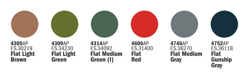| Cores Sugeridas | F – Gunship Gray – 4752AP – F.S. 36118, F – Light Brown – 4305AP – F.S. 30219, F – Light Green – 4309AP – F.S. 34230, F – Medium Gray – 4746AP – F.S. 36270, F – Medium Green I – 4314AP – F.S. 34092, F – Red – 4606AP – F.S. 31400 |