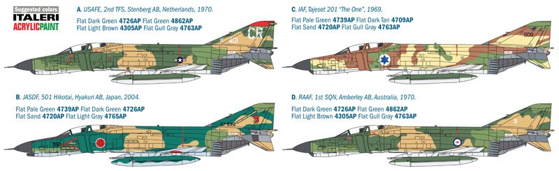 SUPER DECALQUES PARA 4 VERSÕES Projetado pela empresa americana McDonnell Douglas e entrou em serviço na década de 60, o caça-bombardeiro supersônico de dois lugares F-4 Phantom II para todos os climas está entre as aeronaves mais conhecidas e famosas da história da aviação militar. Inicialmente projetado para a Marinha dos EUA, também foi amplamente utilizado pelos EUA. Força Aérea e teve sucesso comercial significativo em todo o mundo. A versão “E” do Phantom II, em detalhes, desenvolvida especificamente para os EUA. Força Aérea, caracterizava-se por um canhão M61 Vulcan posicionado no nariz e podia ser armado, para missões de interceptação, com os mísseis ar-ar AIM-9 Sidewinder e AIM-7 Sparrow. Os dois potentes motores General Electric J-79 permitiram ao Phantom II ultrapassar a velocidade de 1.240 nós (aproximadamente 2.300 km/h). Velocidade, aceleração e fiabilidade eram de facto os pontos fortes do Phantom, capazes de contrabalançar a reduzida manobrabilidade devido ao seu grande tamanho.