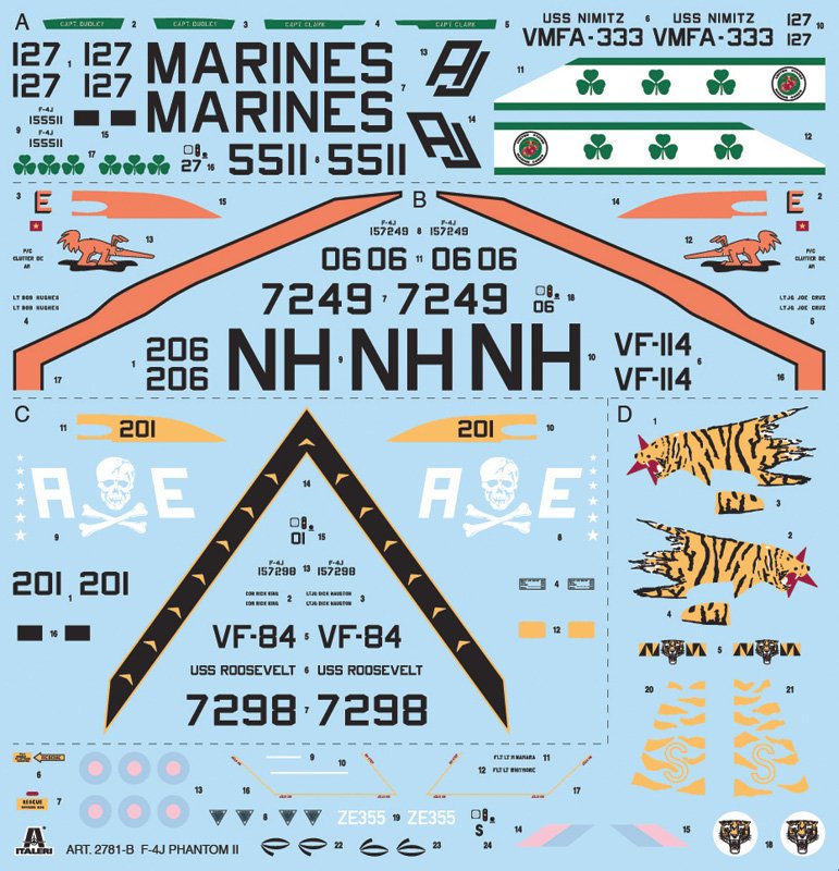 2 SUPER DECALQUES PARA 4 VERSÕES – INSTRUÇÕES DE CORES Projetado pela empresa americana McDonnell Douglas e entrou em serviço na década de 60, o caça-bombardeiro supersônico de dois lugares F-4 Phantom II para todos os climas está entre as aeronaves mais conhecidas e famosas na história da aviação militar. Inicialmente projetado para a Marinha dos EUA, também foi amplamente utilizado pelos EUA. Força Aérea e teve sucesso comercial significativo em todo o mundo. A versão original destinada à Marinha dos EUA foi ainda melhorada em 1966 com o início da produção do Phantom F-4J, caracterizado pela adoção de um sistema de armas capaz de ampliar a capacidade operacional no combate ar-ar e em missões de combate. … ataque ao solo. A aviônica foi significativamente melhorada e o inovador sistema de controle de alvo look-down/shoot-down foi adotado. Também foram utilizados dois novos motores J79-GE 10, com maior empuxo, que permitiram ao Phantom II ultrapassar a velocidade de 1.240 nós (cerca de 2.300 km/h). Velocidade, aceleração e fiabilidade eram de facto os pontos fortes do Phantom, capazes de contrabalançar a reduzida manobrabilidade devido ao seu grande tamanho.
