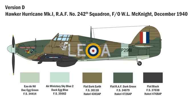 SUPER DECALQUE PARA 4 VERSÕES – FOLHA DE INSTRUÇÕES DE CORES O Hawker Hurricane foi o caça mais difundido usado pela Força Aérea Real Britânica no início da Segunda Guerra Mundial. O Hurricane era movido por um motor Rolls-Royce Merlin de 12 cilindros em linha e refrigeração líquida com mais de 1.000 HP, que poderia levá-lo a uma velocidade de mais de 500 km/h. As 8 metralhadoras Browning de 7,7 mm com as quais estava equipado também garantiam um bom poder de fogo. Embora fosse mais lento e antiquado, em termos de design aerodinâmico, do que o seu famoso colega Supermarine Spitfire, com quem partilhou o compromisso operacional durante a Batalha da Grã-Bretanha, era ainda mais robusto, económico e mais fácil de manter e reparar. Também foi mais fácil voar e o treinamento dos pilotos foi mais rápido. Ele contribuiu significativamente para a vitória da R.A.F. durante a Batalha da Grã-Bretanha, mas, ao longo da guerra, cedeu progressivamente o papel de lutador da linha de frente para o Spitfire, muito mais moderno.