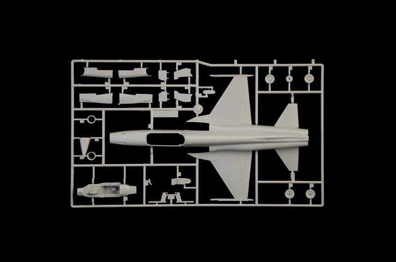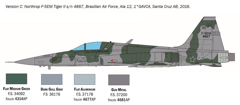 SUPER DECALQUES PARA 4 VERSÕES – INSTRUÇÕES DE CORES, FIGURAS NÃO INCLUÍDAS – CONTÉM 1 MODELO O Northrop F-5 nasceu na década de 1960 para atender às necessidades de muitos países da OTAN que exigiam um caça multifuncional simples, econômico e de fácil manutenção. Da sua fuselagem original, o F-5E Tiger II nasceu no início dos anos 1970. Equipado com um par de novos motores J85-GE-21 capazes de garantir potência e empuxo significativamente superiores à versão anterior, caracterizava-se por uma fuselagem alongada e alargada. O melhor desempenho de voo obtido com o novo layout aerodinâmico, a maior autonomia operacional e a aviônica atualizada permitiram que o Tiger II fosse utilizado com sucesso por inúmeras forças aéreas. O armamento básico é composto por dois canhões de 20 mm, instalados no nariz sob a cabine, e possibilidade de utilização de diversas combinações de mísseis ar-ar. Além de sua função principal de caça, ainda mantinha amplas capacidades de ataque ao solo.