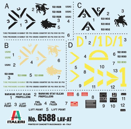 PNEUS DE BORRACHA – CORES INSTRUÇÕES IMAGEM NÃO INCLUÍDA O LAV-25 é um veículo blindado com tração nas 8 rodas, caracterizado por boa capacidade anfíbia, utilizado desde o início da década de 1980 pelo Corpo de Fuzileiros Navais para atividades de reconhecimento e apoio à infantaria. Entrou em serviço em 1983 e participou ativamente nas operações “Tempestade no Deserto” (1991), “Restaurar Esperança” (1993), “Liberdade Duradoura” (2001) e “Operação Liberdade do Iraque” (2003). Equipado com motor diesel, que permite ao LAV atingir os 100 km/h, e com sistema de suspensão independente das rodas, o que o torna ideal para utilização “todo-o-terreno”, foi desenvolvido e construído em inúmeras versões. A versão antitanque está equipada com o sistema Emerson TUA. (Tow-Under-Armour) 901A1, um sistema de mísseis armado com mísseis guiados antitanque TOW-2, instalado em uma torre giratória e equipado com sistemas de identificação de alvos térmicos e visuais. Projetado para operar em unidades de reconhecimento da Marinha, a versão antitanque é capaz de fornecer capacidade de contra-ataque contra os mais poderosos tanques de batalha inimigos.