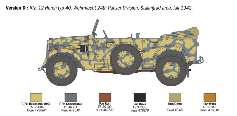 PNEUS DE BORRACHA – DECALQUES PARA 4 VERSÕES – FOLHA DE INSTRUÇÕES DE CORES Um ambicioso projeto de mecanização para as forças armadas alemãs foi iniciado em meados da década de 1930. De facto, foi considerado estratégico equipar a Wehrmacht com um chassis militar padrão capaz de optimizar a mobilidade fora de estrada das tropas. Entre as diversas versões propostas, o carro médio com tração nas quatro rodas produzido pela Opelwerke e pela Auto Union teve uma importante difusão. O chassis médio foi montado em diversas configurações para torná-lo adequado ao transporte de tropas, reboque de reboques, reconhecimento e, por último mas não menos importante, para satisfazer as necessidades dos departamentos de transmissão. O Kfz. 12, construído pela Horch (Horch fazia parte do grupo Auto Union juntamente com Wanderer, Audi e DKW), provou, graças ao seu design simples mas eficaz, muito fiável e robusto em todos os ambientes operacionais.