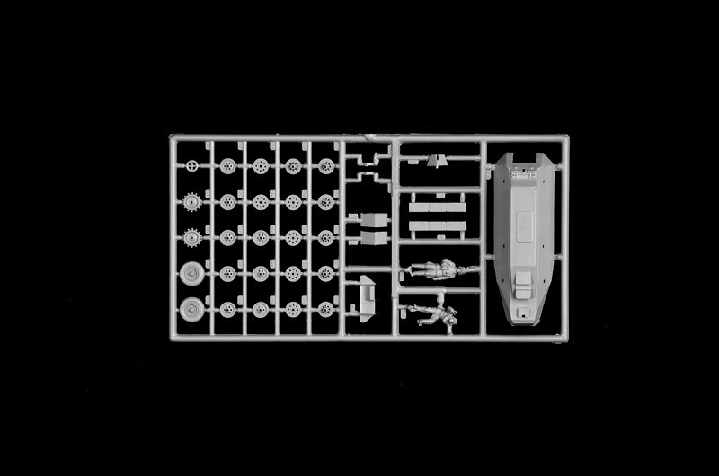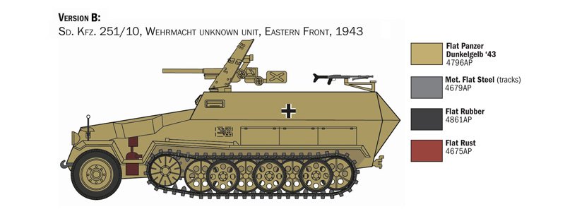 ESTEIRAS DE LINK AND LENGHT – DECALQUES PARA 3 VERSÕES – CONTÉM 4 FIGURAS – INSTRUÇÕES DE CORES A meia pista de transporte de tropas Sd.Kfz.251 foi usada pela Wehrmacht em todas as frentes, e em grande escala, durante a Segunda Guerra Mundial. Alimentado por um motor a gasolina Maybach de 6 cilindros, era capaz de atingir os 55 km/h, mesmo em terrenos difíceis. Foi usado principalmente como veículo de combate de infantaria, mas, durante a guerra, foram produzidas numerosas versões para satisfazer tarefas operacionais cada vez mais especializadas. A meia pista Sd.Kfz. 251/10 (Schützenpanzerwagen), usado como veículo de comando de pelotão, estava armado com um canhão antitanque PaK 36 de 37 mm com escudo protetor. A produção foi realizada até 1942, quando o canhão não era mais eficaz contra os tanques inimigos mais avançados e blindados.